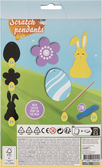 Découvrez une activité créative pour enfants et adultes avec ces pendentifs de Pâques à gratter. Le coffret comprend 3 images en forme de pendentifs et un grattoir pratique pour créer facilement des motifs colorés.