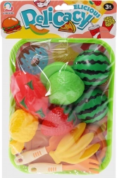 Amusant et sûr, le set de fruits à découper pour petits chefs dès 3 ans. Comprend des fruits à découper, un couteau, une fourchette, une planche à découper et un plateau 22 × 16 cm – idéal pour développer la motricité fine et jouer à la cuisine.
