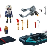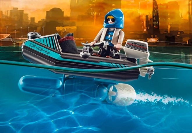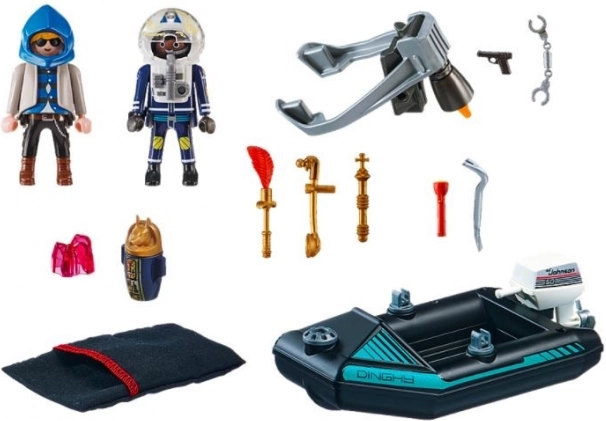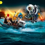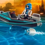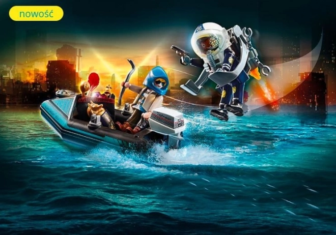 Tout est prêt pour l’action dans Playmobil City Action. Le policier avec jetpack s’approche rapidement du voleur qui s’échappe en bateau avec des œuvres volées. Grâce à son ingéniosité et à son équipement, l’agent neutralise le criminel en un rien de temps et restitue les objets précieux au musée.