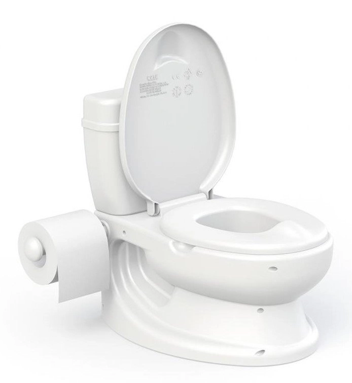 Ce pot réaliste en forme de toilette aide les enfants à passer des couches aux toilettes de manière ludique et motivante. Il offre un son de chasse d’eau, un porte-papier toilette, un bol amovible pour un nettoyage facile et une base antidérapante pour une utilisation en toute sécurité.