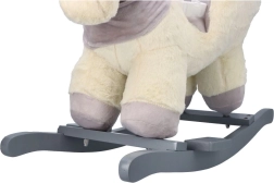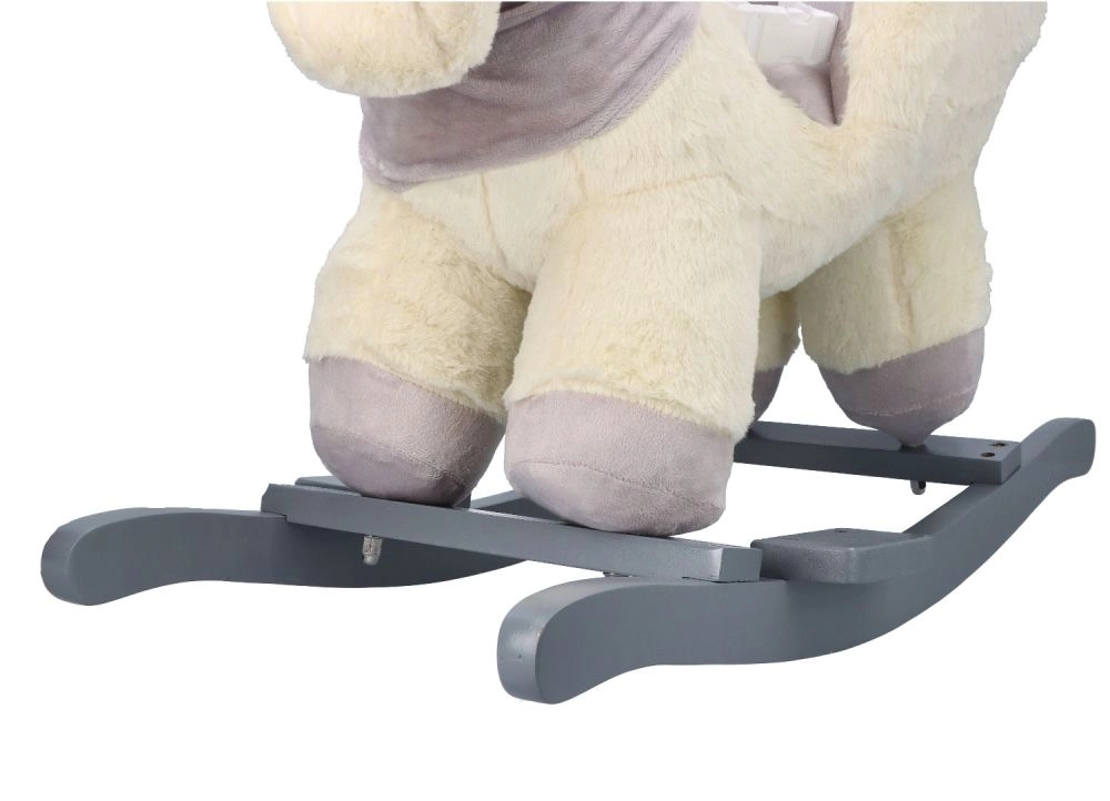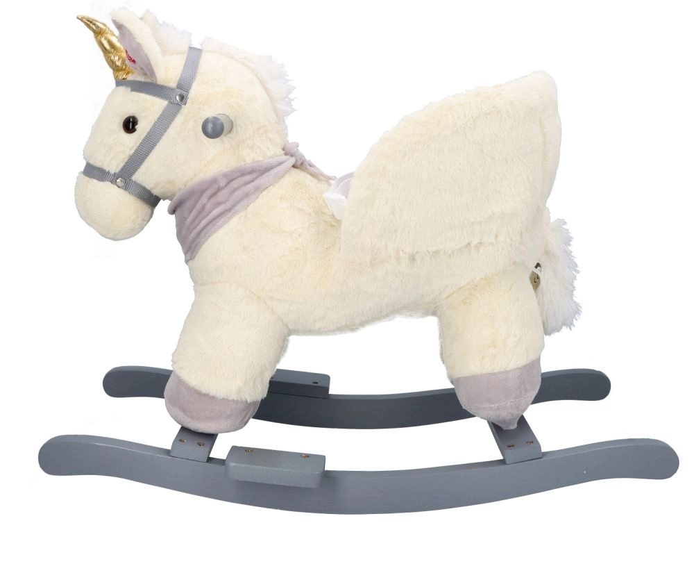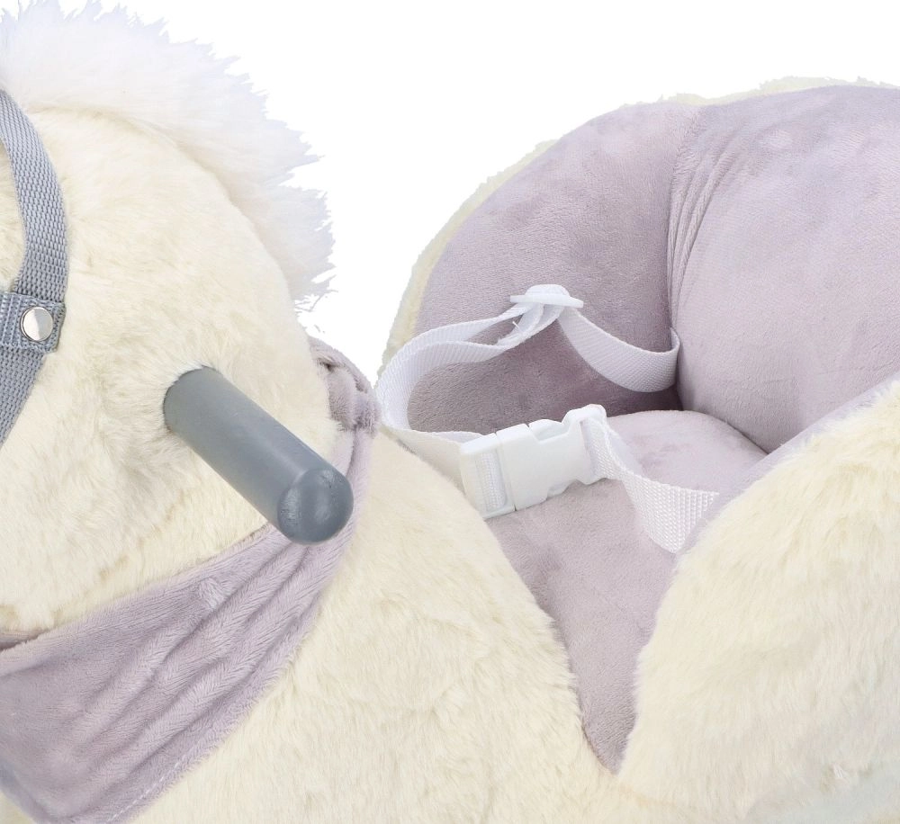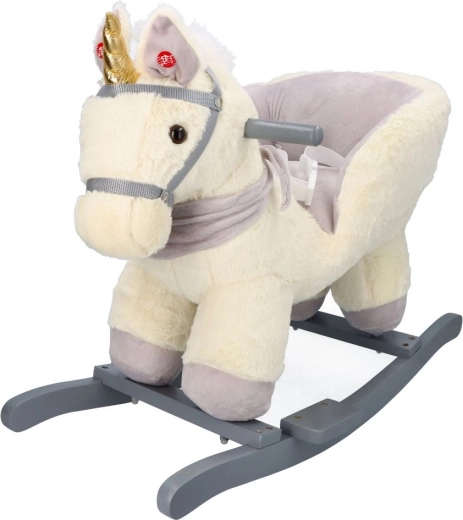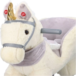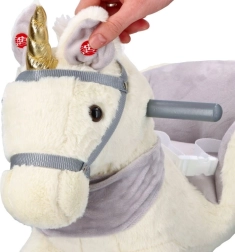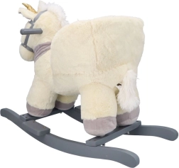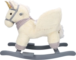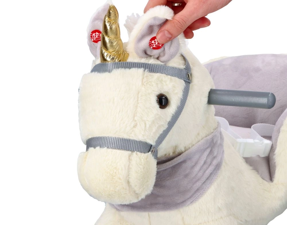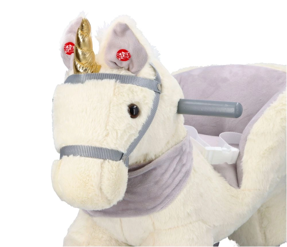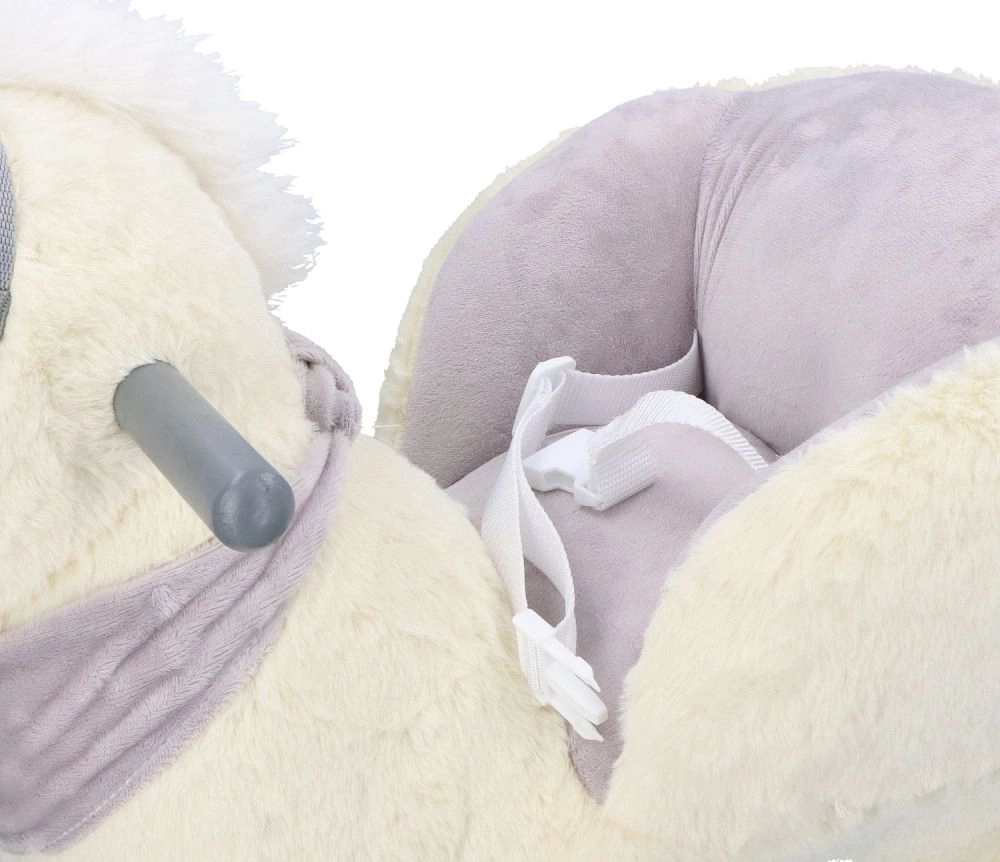 Cette licorne à bascule en peluche, avec corne dorée et délicats détails gris, est un choix idéal pour s’amuser à la maison. Le siège doux avec accoudoirs et ceinture de sécurité assure confort et stabilité, tandis que les patins en bois et les poignées offrent un mouvement sûr et fluide.
