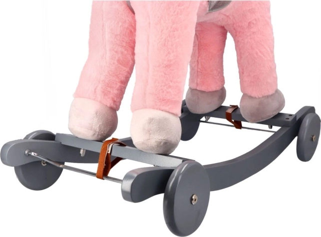 Le cheval est équipé de roues, ce qui permet également un déplacement facile et élargit l’usage au-delà du simple balancement.