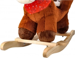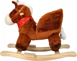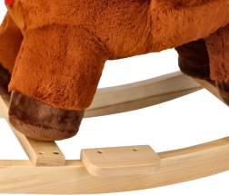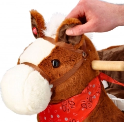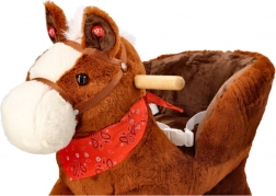 Le cheval à bascule est doté d’un corps marron doux, d’une crinière blanche et d’un foulard rouge, lui conférant un aspect réaliste et sympathique.