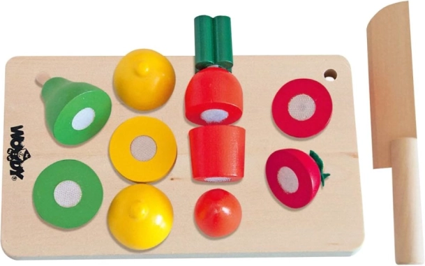Set WOODY ludique et interactif pour les petits chefs, comprenant une planche en bois, un couteau et 12 pièces de fruits et légumes pouvant être découpées en toute sécurité grâce au velcro.