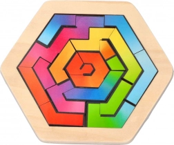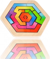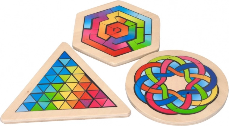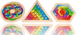 Les pièces colorées permettent de créer des motifs simples comme des ornements plus complexes. Les enfants exercent leur imagination ainsi que la perception des couleurs et des formes.