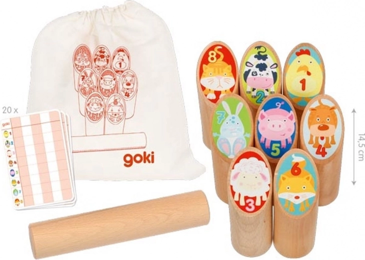 - 8 quilles numérotées, 1 quille de lancer, sac en coton, notice