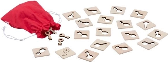 Le mémo tactile Clés est une activité sensorielle et d’observation originale qui favorise la concentration, la coordination œil–main et la discrimination des petites différences. Les joueurs tirent des clés d’un sac et cherchent le plus rapidement possible le gabarit correspondant sur la plaquette en bois – un bon choix rapporte un point.