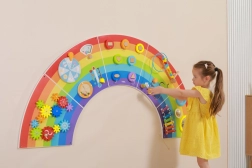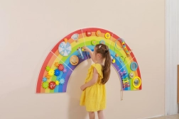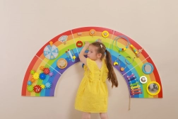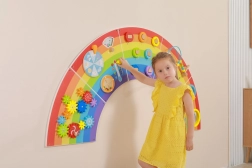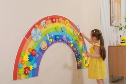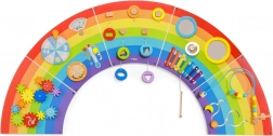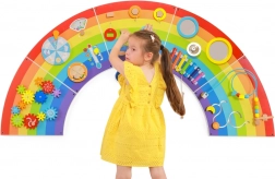 Ce grand tableau d’activités arc-en-ciel est un élément idéal pour les chambres d’enfants, salles de jeux et espaces éducatifs. Les enfants peuvent s’exercer de manière ludique à la coordination œil–main, entraîner leur patience et découvrir les couleurs, les formes, les sons et la météo. Sa forme courbée favorise le jeu simultané d’enfants de tailles différentes.