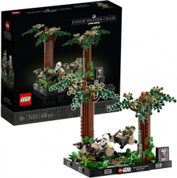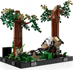 Profitez d’une expérience de construction et recréez la scène de poursuite effrénée sur la lune forestière d’Endor. Le diorama combine des détails authentiques avec un design d’exposition épuré : deux speeders inclinables, une paire de troncs d’arbres ajustables et de nouveaux éléments de fougères (5/2023). Sont incluses les minifigurines de la princesse Leia, de Luke Skywalker avec sabre laser vert et d’un scout stormtrooper.