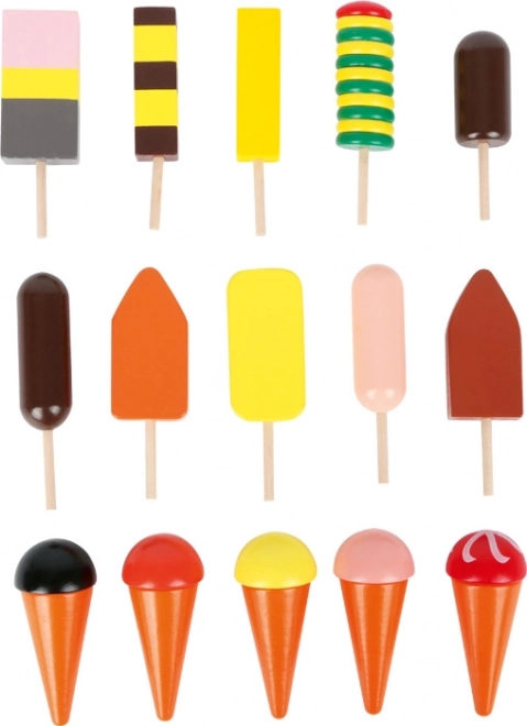 Un ensemble varié de glaces et d’esquimaux en bois inspire les enfants au jeu créatif, au tri et aux associations.