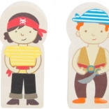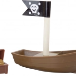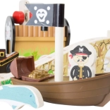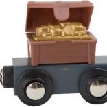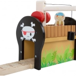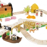 Entrez dans le monde des pirates et de l’imagination. Six pirates règnent sur leur propre circuit de train sur une île, où les rails en bois traversent un pont avec cloche et le train transporte un canon ainsi qu’un coffre rempli d’or. La station de grue avec crochet magnétique permet de charger la cargaison facilement – il suffit de tourner le mécanisme et d’abaisser l’aimant.