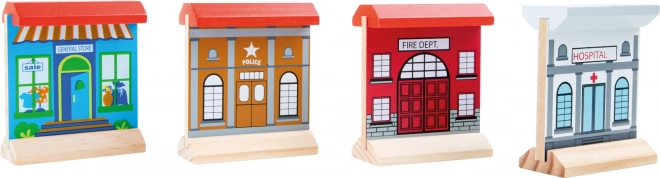 - Des arbres, divers bâtiments en bois et des locomotives et wagons colorés pour compléter le monde ferroviaire des enfants.