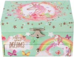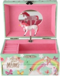 Cette élégante boîte à musique porte-bijoux avec licorne est idéale pour ranger bagues, boucles d’oreilles et petits secrets. À l’ouverture du couvercle avec miroir, après remontage de la clé, la licorne blanc-rose se met à tourner et une douce musique retentit. L’intérieur offre des compartiments pour les bijoux, tandis que le tiroir inférieur accueille d’autres précieux objets.