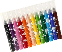 Des feutres sûrs et ludiques pour les tout-petits dès 1 an : pointe bloquée de 5 mm résistante à la pression, encre lavable sur la peau et les textiles, et 12 couleurs intenses avec capuchon ventilé pour créer en toute tranquillité.