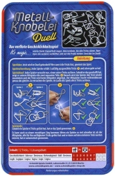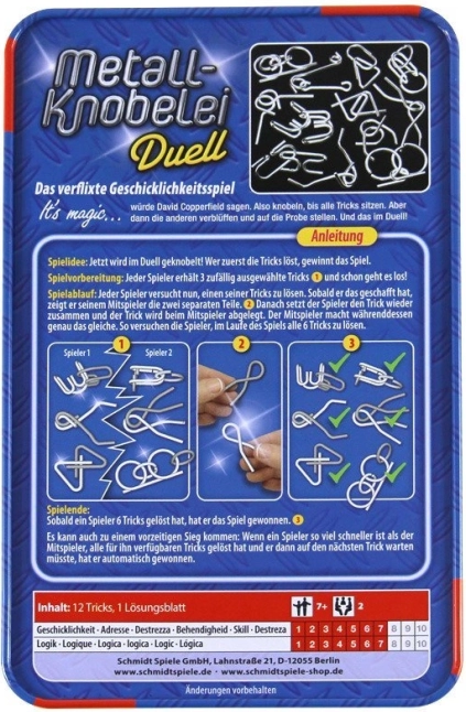 Ce set SCHMIDT Metall-Knobelei Duell propose douze casse-têtes métalliques astucieusement conçus dans une boîte en métal pratique. Chaque pièce mettra à l’épreuve votre patience, votre logique et votre motricité fine: séparez d’abord les deux parties sans forcer, puis remettez-les dans leur forme d’origine. Grâce au mode d’emploi illustré inclus, vous pouvez consulter des indices à tout moment.