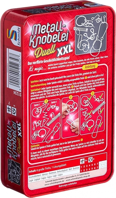 SCHMIDT présente l’incroyable set de casse-têtes métalliques Duell XXL, conçu pour les amateurs d’énigmes logiques et de réflexion stratégique. Chacun des six casse-têtes est composé de deux pièces, et votre tâche consiste à trouver comment les séparer sans force, puis à les réassembler dans leur forme d’origine. Les casse-têtes sont livrés dans une boîte en métal élégante, garantissant un rangement sûr et un transport facile.